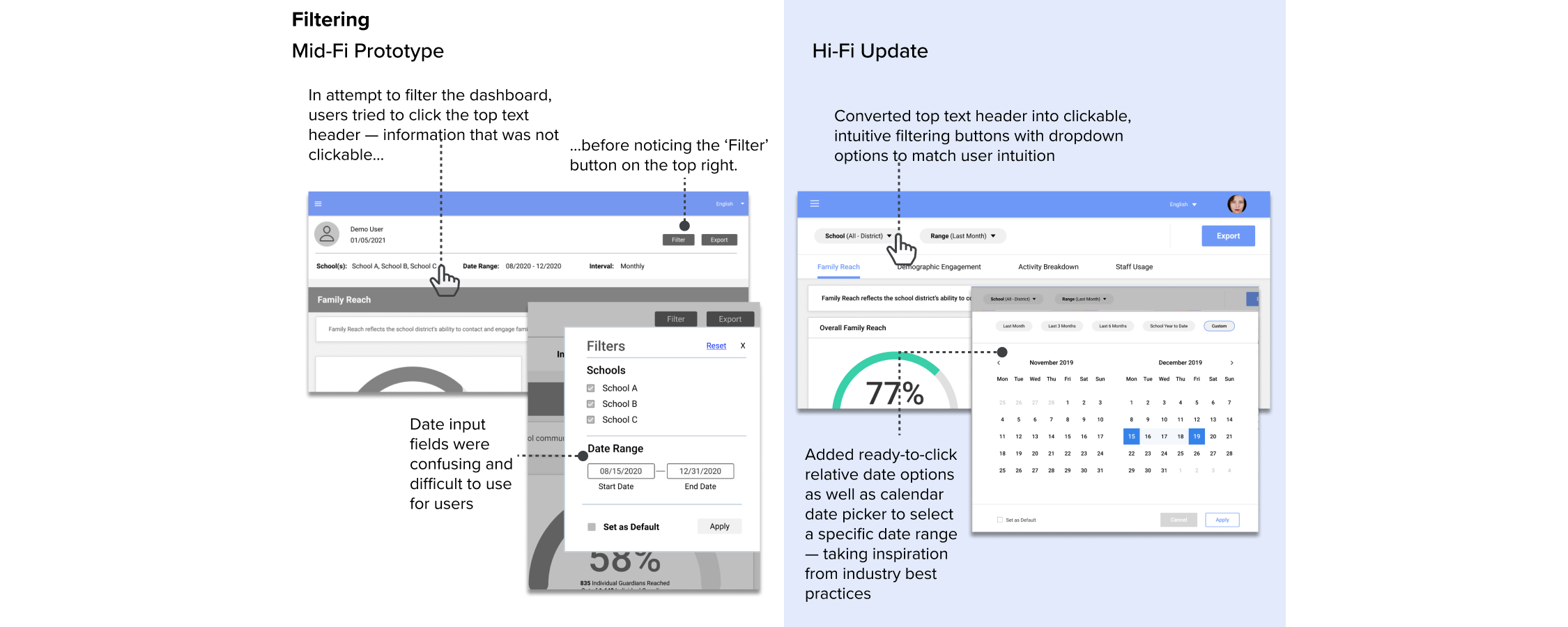 Taking this feedback, we iterated on the designs to address the observed problems. Below highlight a few redesigns, comparing the mid-fi prototype feedback (left) and the revisions (right) made to address it.