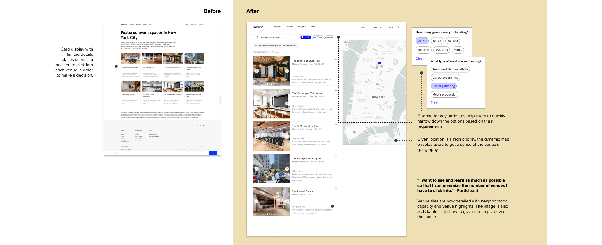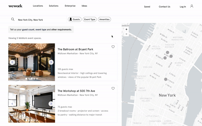I designed an event venue inventory search experience that allows people to quickly navigate and discover WeWork venues and services that may fit their event needs. By supplying more informaton relevant to their priorities, users can better understand the offering and action on it.