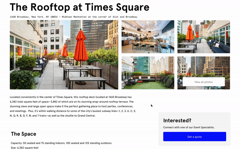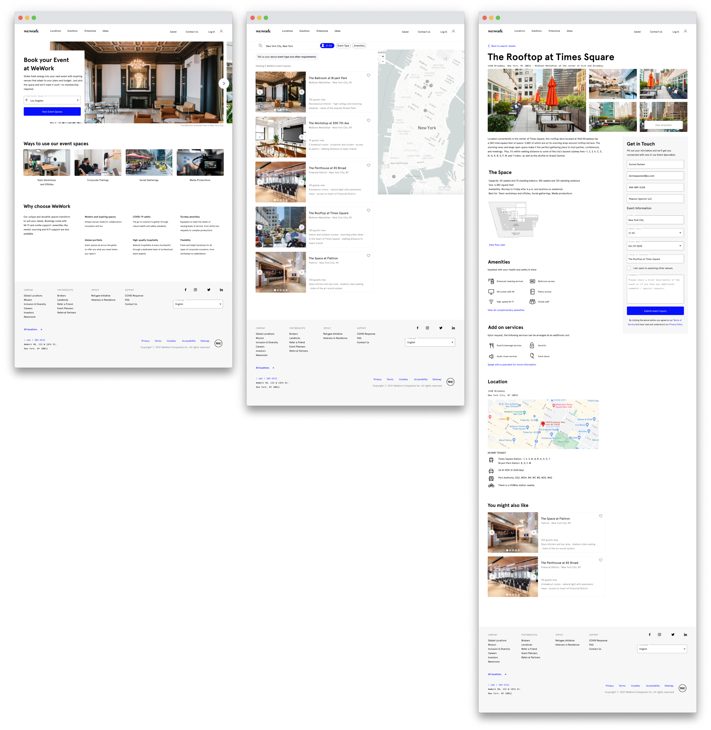 I turned my lo-fi wireframes into a mid-fi prototype for usability testing. The new design offered a more efficient discovery process via an inventory search and more relevant information to help with decision-making. The design was also modeled after WeWork’s co-working website to establish design unity across products, while incorporating event-specific nuances.