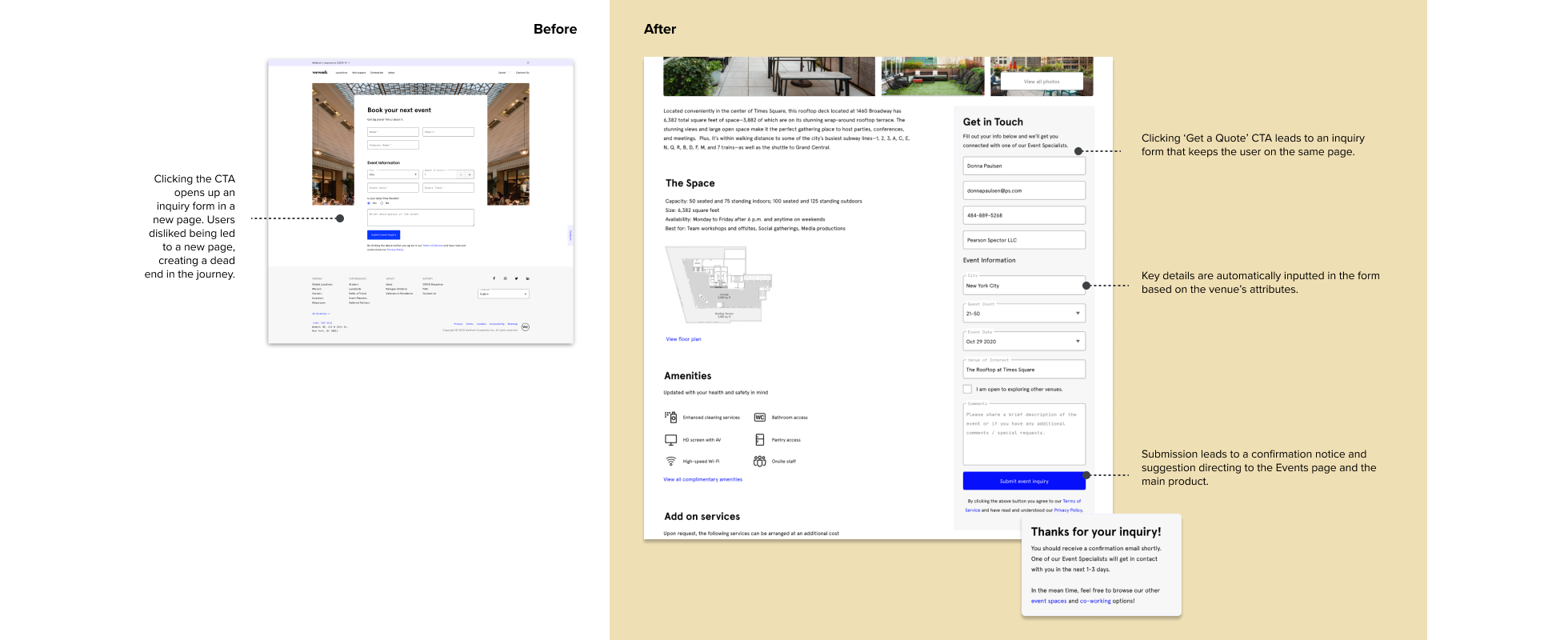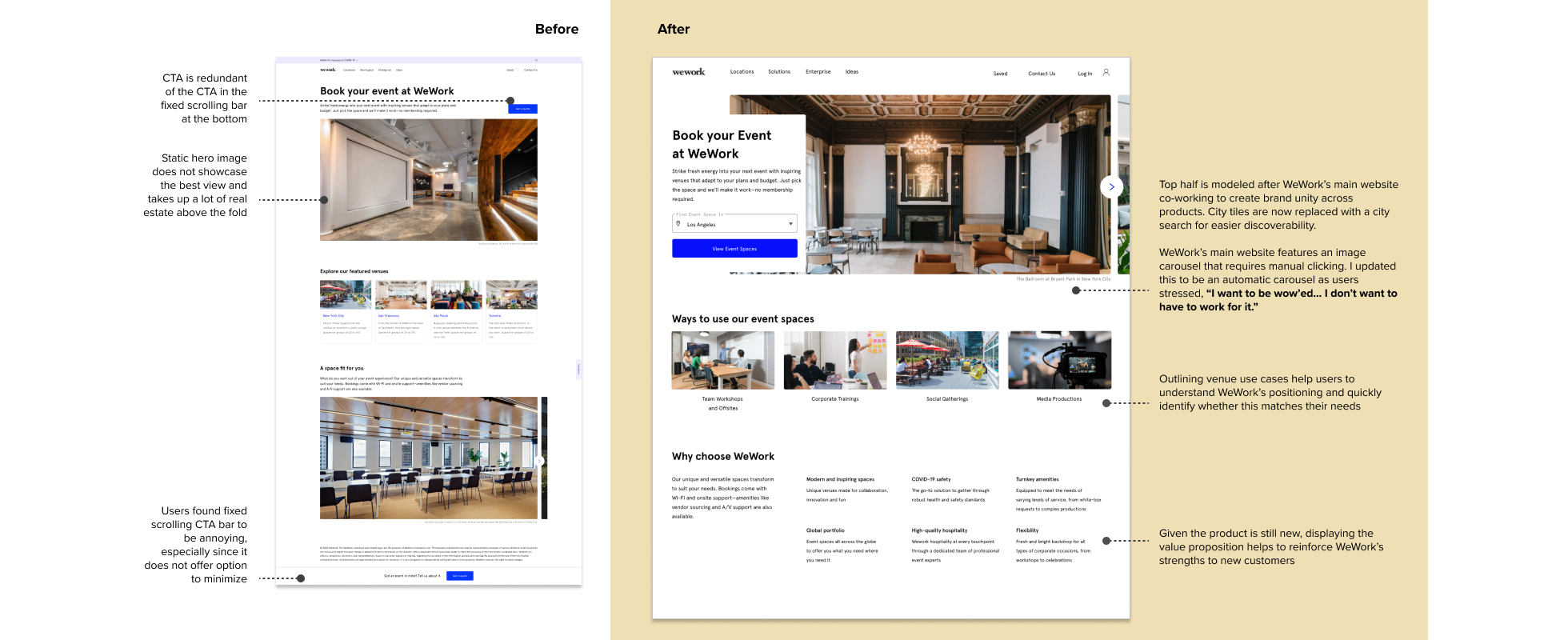 I first conducted a variety of research to analyze the current state. This included completing a site analysis to identify areas for improvement, a competitive assessment to compare against the market and interviews with WeWork event operations leads and past event customers.