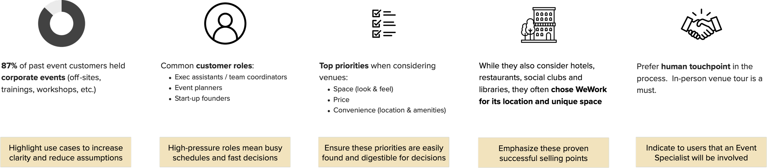Leveraging research insights, I developed a persona to better empathize with user needs. For a busy user like Elizabeth, it is key to provide an experience that helps her quickly decide whether WeWork has the venue & service that fits her needs.