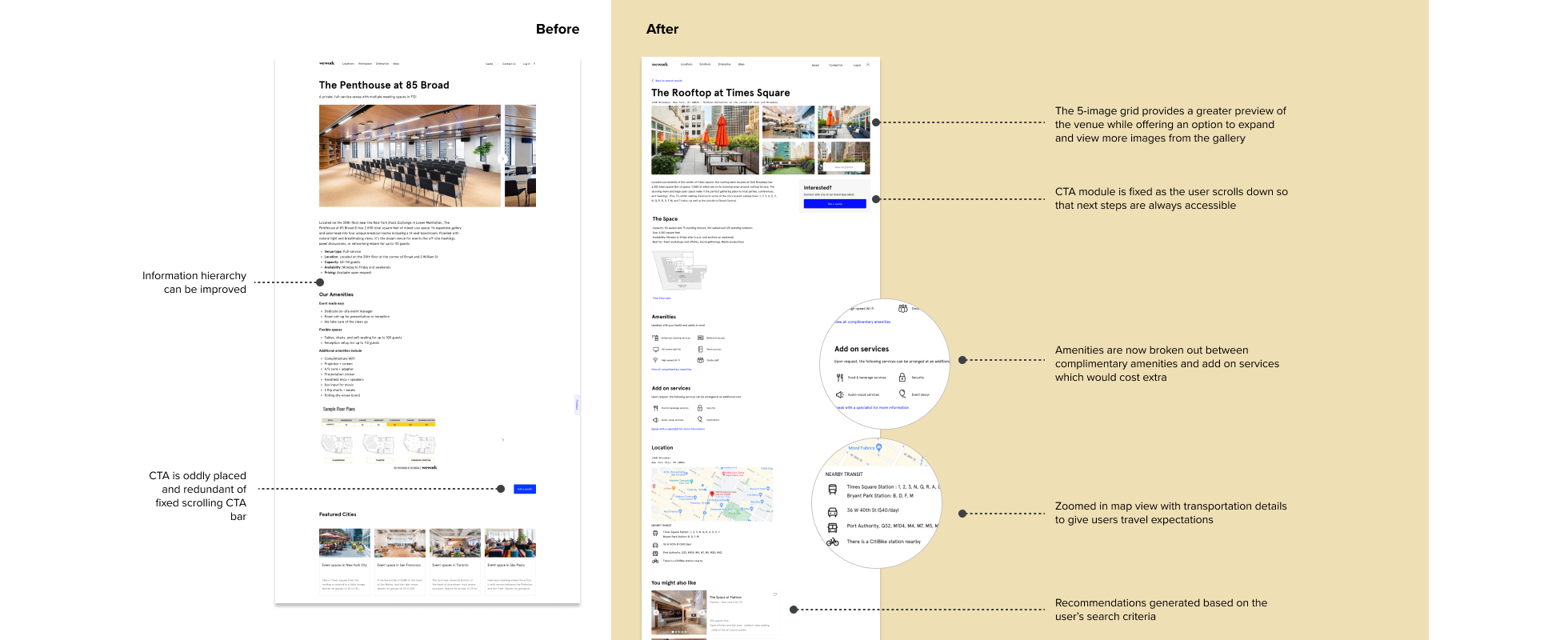 Those ideas guided my sketches as I designed ways to achieve effective information hierarchy. I consistently referred to the primary user’s priorities, as well as WeWork’s main website design to guide the ideation. Taking my best ideas, I elevated the sketches to wireframes.